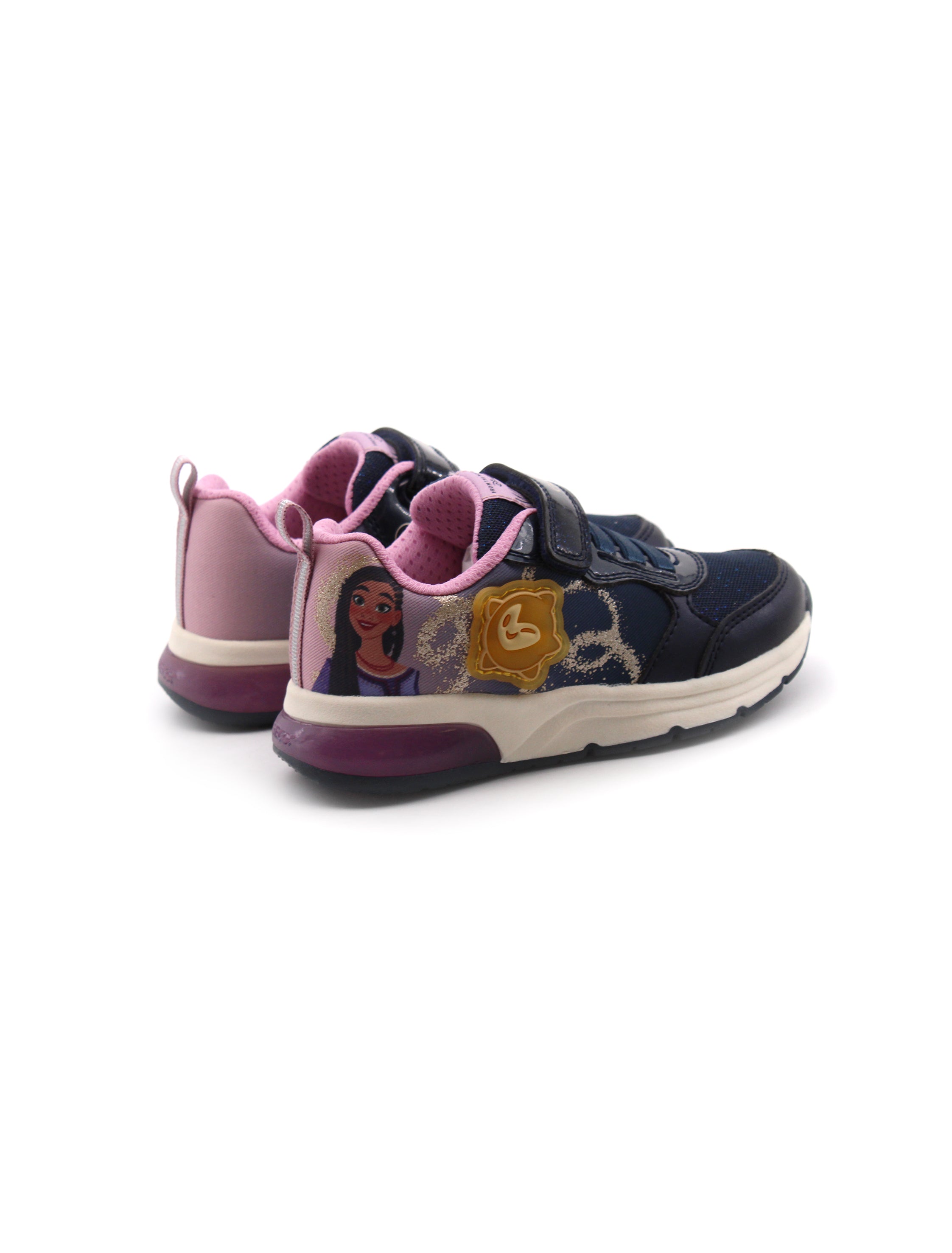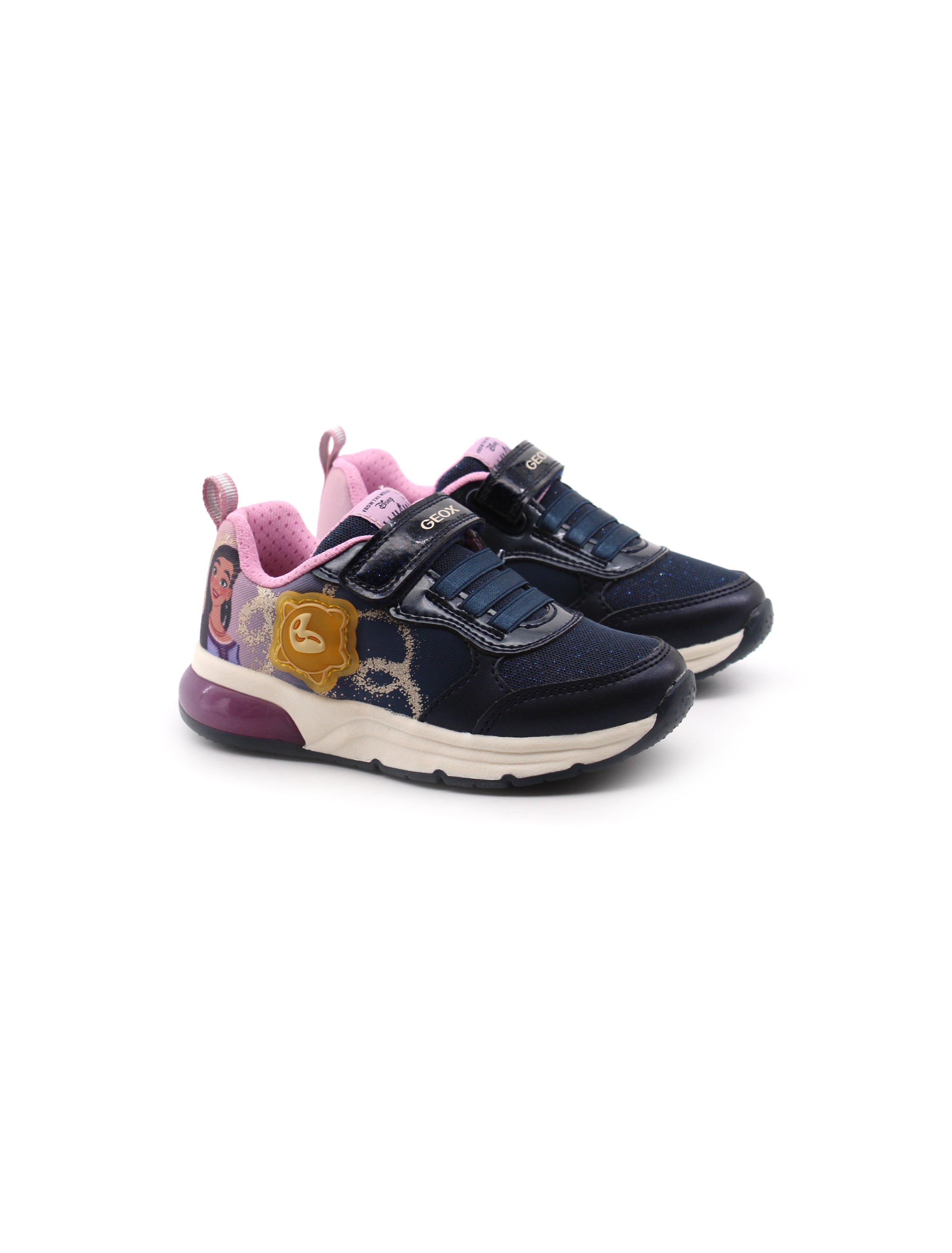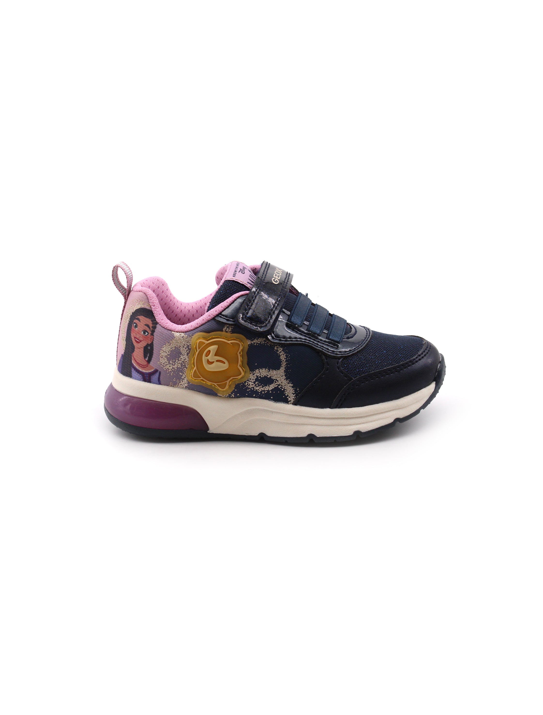 Sneaker con luci da bimba Geox Disney Spaceclub in tessuto con stampe e materiale sintetico con luce laterale, soffice plantare traspirante in tessuto e suola traspirante in gomma con luci. Comoda da indossare grazie alla chiusura con lacci elastici e velcro.